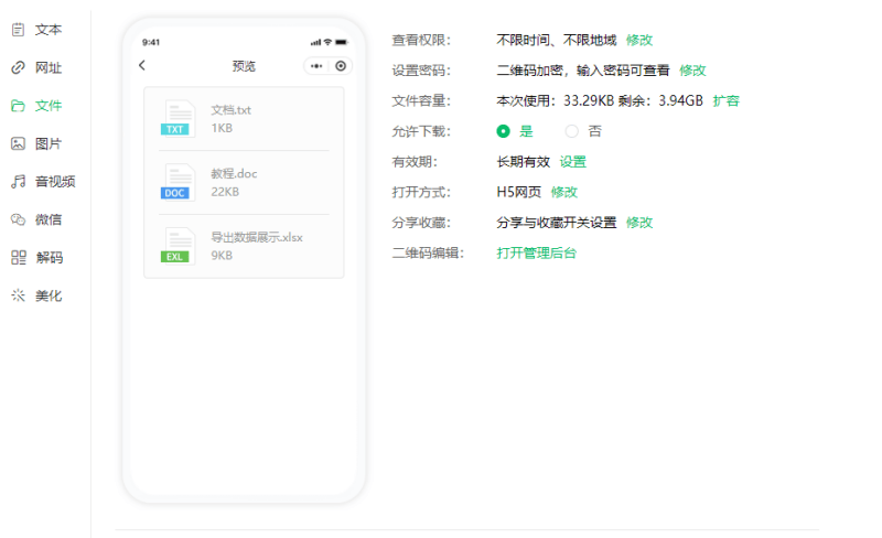 扫码可以在线预览或下载文件,支持设置访问权限,比如有效期、密码、访问次数、时间等。