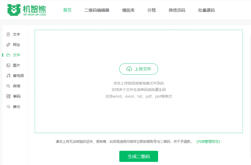 在机智熊二维码上选择【文件】功能,然后将本地文件上传后用鼠标拖动调整排序。