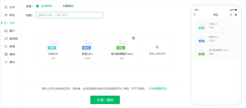 文件做成二维码是怎么生成的呢?现在很多行业都会将相关的文件生成二维码之后,将二维码打印张贴或者分享给其他人,通过扫码的方式来让其他人在扫描设备上查看文件内容,也可以将文件下载到手机上,从而更加方便的获取文件。那么文件二维码制作的步骤是什么样的呢?通过下面的文章来带大家了解二维码在线生成的操作方法,只需要简单几步操作就可以将单个或者多个文件转换二维码(https://www.jzx.com/fi